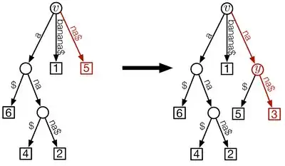 - Add a new internal node and a new edge with label . The new label consists of the missing characters of the longest common prefix of and . Thus, the concatenation of the labels of the root-to- path now displays the longest common prefix of and .