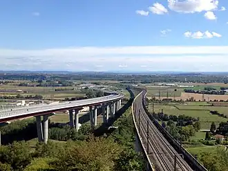 The LGV Rhône-Alpes (French: Ligne à Grande Vitesse; English: high-speed line) is a 115 km (71 mi) French high-speed rail line situated in the Auvergne-Rhône-Alpes region which extends the LGV Sud-Est southwards. Opened to service in 1994, the line bypasses the built-up Lyon area towards the east; in addition it serves Lyon-Saint-Exupéry TGV station (known until June 2000 as Satolas TGV station). Beyond Valence TGV station the line is continued by the LGV Méditerranée. LGVs Rhône-Alpes, Sud-Est and Méditerranée, when completed, received their official nickname, the City To Coast (C2C) Highway ("Ville à la Mer").