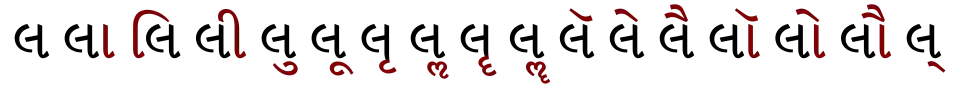| ल | ला | लि | ली | लु | लू | लृ | लॄ | लॢ | लॣ | ले | लै | लो | लौ | ल् |