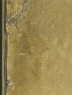 In 2011, after the publication of the first edition of their book, Kemp and Pascal Cotte reported that there was evidence that the drawing had once been part of a copy in the National Library of Poland in Warsaw of the Sforziada.[32] This is a printed book with hand-illuminated additions containing a long propagandistic poem in praise of the father of Ludovico Sforza, who was Leonardo's patron, recounting the career. The Warsaw copy, printed on vellum with added illumination, was given to Galeazzo Sanseverino, a military commander under Ludovico Sforza, on his marriage to Bianca Sforza in 1496.[4] Kemp and Cotte identified where two sheets were missing from this volume from which they believe the drawing was cut. Kemp and Cotte say that, although "the dimensions and precise locations of the holes in the portrait cannot be obtained with precision", the three holes on the left-hand side of the drawing can be aligned with three of the five stitch holes in the sheets in the book.[7][33][34]