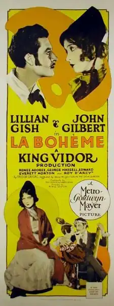 La Bohème is a 1926 American silent drama film directed by King Vidor, based on the 1896 opera La bohème by Giacomo Puccini. Lillian Gish and John Gilbert star in a tragic romance in which a tubercular seamstress sacrifices her life so that her lover, a bohemian playwright, might pen his masterpiece. Gish, at the height of her influence with Metro-Goldwyn-Mayer studios, asserted significant control over the production, determining the story, director, cast, cinematography, and costume design.[1] In February 2020, the film was shown at the 70th Berlin International Film Festival, as part of a retrospective dedicated to King Vidor's career.[2]