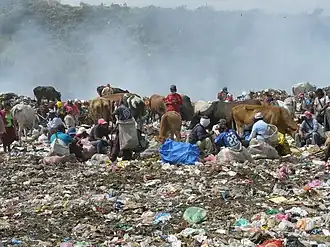 Managua's population has considerably expanded since 1995.[5] Consequently, garbage production has also increased. Managua produces over 1,200 tons of garbage daily.[3] There are big trucks full of garbage that arrive in La Chureca every day at all hours of the day. There are approximately 3000 individuals who make their living working in La Chureca.[3] Of these, approximately 115–180 families live within La Chureca. The individuals who work and live in La Chureca are named ‘churequeros’ and they are some of the poorest people of the country. Of these, more than 50% are children under the age of 18.[4] Children are most often involved in more than one activity, most frequently: handling glass, metals, and plastics.[4] Working in La Chureca is considered one of the worst forms of child labour in Nicaragua.[4] Some of the most common activities of La Chureca workers of all ages include: recollection, classification, selling, storing, and cleaning of recyclable waste.[6] Over the years, ‘churequeros’ have figured out ways of organizing the trash and making small profits off salvageable and recyclable materials.[5] These individuals swarm all around La Chureca with makeshift spears which are used to pick through the garbage which is then sorted and sold to suppliers of recyclable materials. Workers in La Chureca are self-employed individuals and, or families who collect salvageable items such as plastic, aluminum cans, and scrap metals such as copper and iron.[5] These workers are highly organized labour chains. That is, if one person collects glass, the other will clean it, another will crush and recycle it and another will sell it to a collector who will then sell it to different companies.[3] It is clear that the existing piles of garbage would be much larger if it were not for the individuals that work there.[3] La Chureca produces approximately US$20 million a year in marketable garbage and Churequeros earn between US$1.50 and US$2 a day.[5] Materials are often sold by the pound. For example, eleven pounds of aluminum equates to roughly twelve córdoba profits (US$0.63) for garbage sorters.[5]
