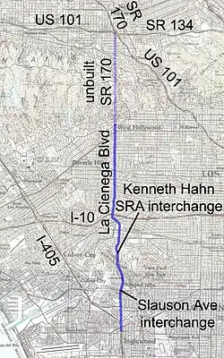 Between Obama Boulevard and Manchester Avenue, most of La Cienega Boulevard is a divided, limited access expressway with few traffic signals. In the late 1940s, as part of the proposed Laurel Canyon Freeway, La Cienega was constructed to freeway standards with several grade-separated interchanges. Emergency call boxes like those found along the area's freeways were also installed along that stretch in the early 1970s. The Laurel Canyon Freeway was never completed. This stretch of La Cienega passes through the Kenneth Hahn State Recreation Area, Baldwin Hills, the Inglewood Oil Field, and Ladera Heights.