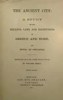 The Ancient City: A Study on the Religion, Laws and Institutions of Greece and Rome (French: La Cité antique), published in 1864, is the seminal book of French historian Numa Denis Fustel de Coulanges (1830–1889). Taking inspiration from René Descartes,[1] and based on texts of ancient historians and poets, Fustel investigates the origins of the most archaic institutions in the Greco-Roman world.