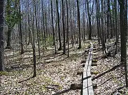 The Baie Fine section runs for 14 kilometres, and is known for its gentle rolling hills, hardwood forests, beaver dams, and pink granite. It begins at the trailhead - a large, informative sign detailing the history of the trail. The forest comprises red and yellow birch, red maple, white pines, and black spruce.[2] The terrain is, for the most part, flat, with a few steep pitches and creek crossings along the way. It concludes with a steep portage up an old logging road that leads to Threenarrows Lake. Local legend has it that the area was once a summer getaway for notorious gangster Al Capone.