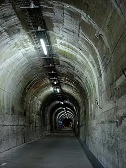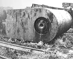 Conventional bombing raids only achieved a single bomb hit on the dome itself, causing negligible damage. However, in June and July 1944 the RAF began attacking the site with 12,000 pounds (5,400 kg), ground-penetrating Tallboy bombs.[16] The external construction works were completely wrecked by the bombing and one Tallboy landed just beside the dome, blowing out the entire quarry cliff face and burying the entrances to the Gustav and Gretchen tunnels. The entrance to Sophie was also buried, leaving Ida as the only entrance to the facility. The dome was unscathed but the buttresses supporting the protective Zerschellerplatte were dislodged and slid partway down into the quarry. Serious damage was also caused to the tunnels beneath the dome. The damage made it impossible to continue work on the site. Dornberger complained: "Persistent air attack with heavy and super-heavy bombs so battered the rock all around that in the spring of 1944 landslides made further work impossible."[27] His staff reported on 28 July 1944 that, although the dome had not been hit by the Tallboys, "the whole area around has been so churned up that it is unapproachable, and the bunker is jeopardised from underneath."[27]