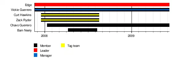 While the group consisted of six members, Vickie and Edge were the central focus and were known for their grotesquely hyperbolised displays of affection, such as primal kisses.[1] As well as frequently kissing on screen, the couple often showed video packages of them in comically blissful situations such as playing on swings and feeding each other while having a picnic. As well as these romantic scenes, the pair would often be shown indulging activities unrelated to wrestling, such as having a pedicure and other beauty treatments.[2] Also, despite not being a wrestler, Vickie Guerrero played a central role in the group not only in aiding Edge's career,[1] but also earning the ire of many wrestlers which resulted in her frequently being attacked and consequently appearing in a wheelchair or wearing a neck brace, which became somewhat iconic for Vickie at the time.[3] She also became notorious for her screeching and for shouting "Excuse me!" to gain the attention of booing fans, all started during her tumultuous affair with Edge.[4]