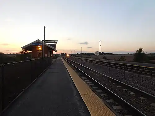 La Fox is the penultimate station on Metra's Union Pacific West Line, located in La Fox, Illinois, an unincorporated area in Kane County, Illinois. The station is 41.1 miles (66.1 km) away from Ogilvie Transportation Center, the eastern terminus of the West Line.[2] In Metra's zone-based fare system, La Fox is in zone 4. As of 2018, La Fox is the 146th busiest of the 236 non-downtown stations in the Metra system, with an average of 295 weekday boardings.[1] Unless otherwise announced, inbound trains use the north (island) platform and outbound trains use the south (side) platform. The northernmost track, despite being adjacent to the island platform, is used exclusively by freight trains.