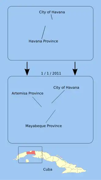 Havana Province (Spanish: Provincia La Habana) was one of the provinces of Cuba from 1976, when the nation's provincial structure was revised, through the end of 2010. On January 1, 2011, the province was divided into two new provinces, Artemisa and Mayabeque.[1] La Habana Province had 711,066 people in the 2002 census.[2] The largest city was Artemisa (81,209), as the much larger city of Havana was structured in a different province, Ciudad de La Habana Province.