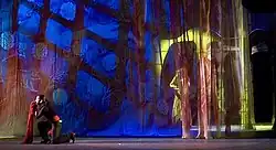 Now free of the time constraints of the 2012 performance, the ballet freely delved into the origin of the curse, the volatile relationship between the Sorceress and the villagers, the village's revenge and the death of the sorceress's son, the naive Adrian, whose death gave rise to the curse. In this staging of La Luna Roja, Estrada took another step away from the traditional fairy tale ending. The play remains similar at heart to the first iteration, but the curse is more poignant. It looks at darker themes such as betrayal and suicide. It biggest departure from the first ballet though was the finale. There is not happy ending waiting for Jamil, no new love to wash away his first loss. Instead of the typical fairytale ending where the hero and heroine come out unscathed, Jamil is forced to contend with the loss of Alba, dancing with nothing more than her memories.[1] The ending to the 2017 ballet is bittersweet, without the comfort of the happy ending of the first staging.