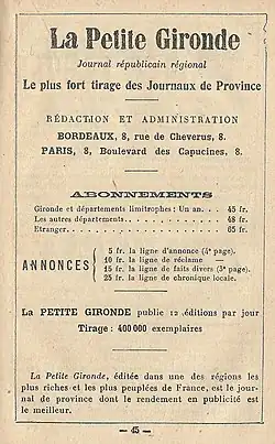 La Petite Gironde (French pronunciation: [la pətit ʒiʁɔ̃d], literally The Little Gironde) was a French daily newspaper from the south and southwest regions of France. It was founded in 1872 and lasted until 1944. With a “moderate republican” tendency, it wanted to be a large regional republican newspaper and a widely consumed cultural product. Originally a moderate centrist, its editorial line straightened out over the years, until it became close to that of L'Action française in the turmoil of the First World War. The newspaper was a collaborationist during the Occupation, which led to its ban after the Liberation of France.[1]