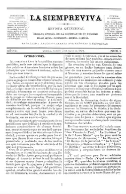 The La Siempreviva periodical published 43 issues over two years, beginning in 1870. Issues cost one real and were published every two weeks. They were generally short, consisting of four pages with each page split into two columns.[6] A variety of essays, poems, and translations appeared in the periodical's "Sección literaria” (transl. 'Literary section'). Writers published by La Siempreviva included Catalina Zapata and Genoveva Gutiérrez. Other writers also contributed under pseudonyms such as "BS," "Clara," "L***," and "RR."[18] Various women served as editor-in-chief of the periodical, including Rita Cetina, Farfán, and Tenorio.[19] Its motto, printed at the top of every issue, was "Bellas Artes, Ilustración, Recreo, Caridad" (transl. 'Fine Arts, Illustration, Recreation, Charity').[20]
