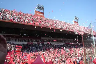 La Barra Del Rojo is the barra brava of the Club Atlético Independiente. They are unusual in Argentina in that they do not have a nickname. It is considered as the largest and strongest barra brava in Argentina.[1][2] The existence of this group has been publicly known since the 1950s. Besides attending Independiente matches, since 1982, the core members of the group attend the national team's World Cups. They also sometimes attend the Copa América.
