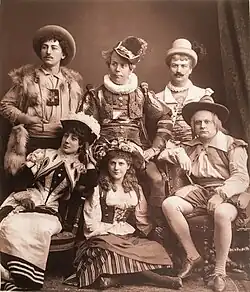 At the premiere of the piece four principals were making their Paris debuts, all of them successfully. The two women were Marie Montbazon (later known as Marie Grisier-Montbazon), who played Bettina, and Mdlle Dinelli (Fiametta). The former was from a theatrical family well known in the French provinces, making her Paris debut at the age of 21; she went on to a successful career, starring in new works by Audran and others during the 1880s and 1890s.[10] Dinelli as Fiametta was equally well received, but had a short career, curtailed by mental illness in 1883.[11] The two male débutants were the tenors: the lyric Lamy and the comic Raucourt, both praised by the Revue musicale.[12]