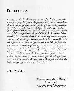 La stravaganza [literally 'Extravagance'] (The Eccentricity), Op. 4, is a set of concertos written by Antonio Vivaldi in 1712–1713. The set was first published in 1716[1] in Amsterdam and was dedicated to Venetian nobleman Vettor Delfino,[2] who had been a violin student of Vivaldi's.[3] All of the concertos are scored for solo violin, strings, and basso continuo; however, some movements require extra soloists (such as a second violin and/or cello solo).