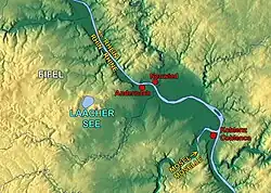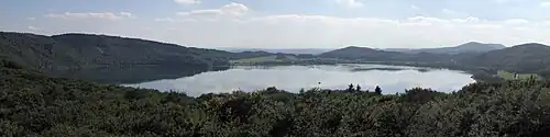 Laacher See (German pronunciation: [ˈlaːxɐ ˈzeː]), also known as Lake Laach or Laach Lake, is a volcanic crater lake with a diameter of 2 km (1.2 mi) in Rhineland-Palatinate, Germany, about 24 km (15 mi) northwest of Koblenz, 37 km (23 mi) south of Bonn, and 8 km (5.0 mi) west of Andernach. It is in the Eifel mountain range, and is part of the East Eifel volcanic field within the larger Volcanic Eifel. The lake was formed by a Plinian eruption approximately 13,000 years BP with a Volcanic Explosivity Index (VEI) of 6, on the same scale as the Pinatubo eruption of 1991.[1][2][3][4][5] The volcanic discharge observable as mofettas on the southeastern shore of the lake is a sign of dormant volcanism.