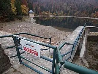1966–1968 the lake was tightened, the dam heightened again, with a flood spillway at the left end. The old gallery was backfilled, a new bottom outlet with a valve tower built. In 2000, the dam and the lake shore were masoned, the dam top fixed with concrete.