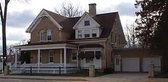 It is a two-story, cream brick house, surrounded by a reproduction wrought iron fence. It has a wrap-around front porch. It was built in c.1878 and c.1903. The cream brick had to be brought by river from the railway at Portage; the house seems to be the only residence in Sauk City built of that material in its era.[2]