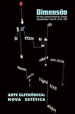 To Clemente Padín, Győri was one of the two Latin American precursors at the electronic poetry field in 1997, alongside with the contemporary artist Eduardo Kac.[31] The Uruguayan poet and performer points out five kinds of Latin American experimental writing: Visual Poetry, Nueva Poesía (close related to Mail art), Performatic Poetry, Holopoetry, and finally, the last stage that subsumes all the previous ones, Virtual Poetry, where the main generator of meanings is the particular bunch of relationships established among all its varied aspects (movement, sound, interactivity, morphing, virtual reality immersion, and so on), including, of course, the verbal and the visual one.[32]