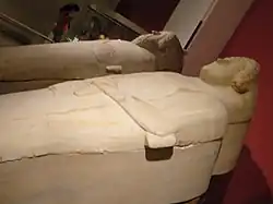 The Lady of Cádiz represents a young woman of serene beauty exceptionally carved on marble. Both the male and female sarcophagus were made in the Phoenician city of Sidon, inspired by Egyptian burial forms and materially executed by Greek artists; they provide important materials of knowledge of the vital customs of the Phoenician people, both in their physical centre of origin and throughout their entire Mediterranean expansion. The fact that carvings of this magnitude were made thousands of kilometres from the place where they were found speaks for itself both of the uses maintained by the Phoenician people and of the same importance acquired by the city of Cádiz as the nerve centre of their presence in the westernmost point of the continent.[5]