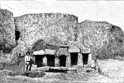 In 1887, there were met with at the gates of Cádiz, at about five metres beneath the surface of the earth, three rude tombs of shelly limestone, in which were found some skeletons, a few small bronze instruments and some trinkets—the latter of undoubted oriental manufacture.[2]