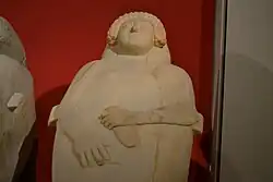 This figure conserves nuanced remains of the colours with which the carvers from the other end of the Mediterranean animated the whiteness of the marble used as the material to be sculpted. Much larger than life size, as is common in this kind of funerary carvings, the sculpture that has now come to be called the Phoenician Lady of Cádiz can be considered with absolute certainty as one of the oldest of its kind. Its realisation is placed around the year 470 BC, an early date in relation to the other similar works that some museums of the world conserve. The trousseau is quite discreet, since the Phoenician-Gaditan society did not show their social status through jewellery.[5]