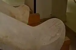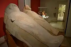 In one of these tombs was also inclosed a monolithic sarcophagus of white marble of the form called anthropoid and measuring 2.15 metres in length by 0.67 in width. This sarcophagus was soon preserved in the local museum, whose director was one Father Vera. According to the account published in the Scientific American four years after the discovery, although the sarcophagus is of essentially oriental manufacture, it has undoubtedly undergone the Hellenistic influence, which implies an epoch posterior to that of Pericles, who died in 429 BC. The personage represented, a man of mature age with noble lineaments and aquiline nose, has thick hair corned up on the forehead in the form of a crown, and a beard plaited in the Asiatic fashion. As for the head, which is almost entirely executed in round relief, that denotes in an undoubted manner the Hellenistic influence, united, however, with the immutable and somewhat hierarchical traditions of Phoenician art. The arms are naked as far as to the elbow, and the feet, summarily indicated, emerge from a long sheath-form robe. As for the arms and hands, they project slightly and are rather outlined than sculptured. The left hand grasps a fruit, the emblem of fecundity, while the right held a painted crown, the traces of which have now entirely disappeared.[2]