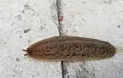Laevicaulis stuhlmanni shows a flattened body and a dark to light brown colour. Adults are on average 45 mm long and 15.5 mm wide. The weight of an adult averages around 3.5 g.[1]