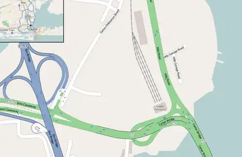![]() OSM map of the station. In the upper left corner is shown its position (the black dot) within the urban area of Lagos | |||||