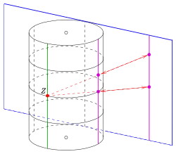 - projects the parabola/line with equation into the plane . So, the image of the parabola/line is the plane section of the cylinder with a non perpendicular plane and hence a circle/ellipse without point . The parabolas/line are mapped onto (horizontal) circles.