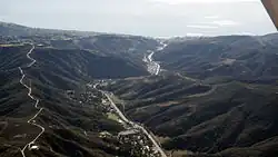 Laguna Canyon, also called Cañada de las Lagunas (Spanish for 'Canyon of the Lakes'),[1][2] is a gorge that cuts through the San Joaquin Hills in southern Orange County, California, in the United States, directly south of the city of Irvine. The canyon runs from northeast to southwest, and is drained on the north side by tributaries of San Diego Creek and on the south by Laguna Canyon Creek. It is deeper and more rugged on the southwestern end near Laguna Beach.