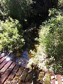 The official source of the Laguna Creek mainstem is in Edgewood County Park on the Serpentine Trail, along which it gently descends westerly until being forced into a culvert near the Interstate-280 underpass for the Edgewood Trail.[1] It emerges on the west side of I-280 and continues west until it crosses Edgewood Road just north of Cañada Road. It is confined in a small reservoir northeast of Cañada Road, then passes beneath into another small reservoir west of Cañada Road, after which it joins the south fork of Laguna Creek. The south fork of Laguna Creek originates near the Sunset (Sunset Way) Trailhead, and descends in a small canyon along the Clarkia Trail until it reaches an earthen berm protecting the PG&E substation. After two right angle turns around the substation it passes into a culvert under I-280, emerging southwest of the I-280 overpass over Cañada Road. From here the south fork flows northwest along the west side of Cañada Road, passing Homestead Pond, then after crossing Phleger and Old Cañada Roads, it is joined by West Fork Laguna Creek (a short creek that flows down along Old Cañada Road). After that the south fork joins the Laguna Creek mainstem northwest of the intersection of Edgewood Road and Cañada Road. From here Laguna Creek is joined on the left (heading downstream) on the Filoli property by locally named Fault Creek, then Spring Creek, then on the right by the Hetch Hetchy Aqueduct and Pulgas Water Temple just before entering Upper Crystal Springs Reservoir.