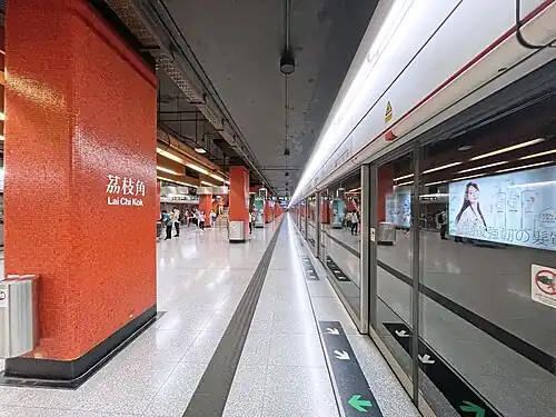 Lai Chi Kok (Chinese: 茘枝角) is an MTR station on the Tsuen Wan line. It is located under Cheung Sha Wan Road. It was opened on 17 May 1982. The station's lineage is Vermilion.