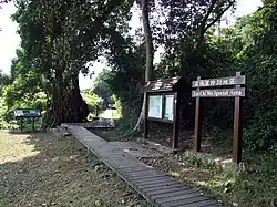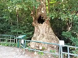 The Hollow Tree is an Autumn Maple (Bischofia javanica) estimated at to about one hundred years old. It reaches a 17-metre high and 1.9-metre in diameter.[20] It is called "hollow tree" because it has a huge hole inside the tree. The hole has openings in both upper and lower section of the tree. It is once said that there was a honeycomb and villagers tried to fire the comb but finally fired the tree altogether. However, the explanations from the description board of the tree told another cause. The parenchyma cells in the centre of the trunk contracted and withered as a result of infection. Small holes began to appear inside the tree. However, the nutrients and moisture transporting cells around the exterior part of the trunk continued to grow and thicken. The trunk later get thicker, and the centre hollow expanded in tandem.