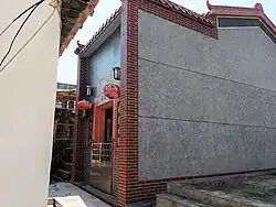 The East Gate and the West Gate are the entrances of the village.[16] The East Gate is the main entrance on which there was engraved a sentence 'The purple cloud comes from the East.' In Chinese, purple means good fortune. The objective of the sentence is to hope to have highly placed or high-ranking government officials and noble lords coming into the village all the time so that it makes the village prosperous and flourishing. On the other hand, there was engraved a sentence 'The west can receive the auspicious light of luck.' on the West Gate. It means the village people hope to get luck and peace.