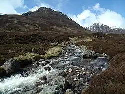 Continuing north the Laoigh crosses the Dee–Avon watershed at 740 metres (2,430 ft) and descends to the Fords of Avon refuge, another 4 kilometres (2.5 mi). Here the line of the Laoigh is crossed by the River Avon flowing west–east down from Loch A'an.[2][7] Despite the stepping stones over the Avon, it may not be possible to cross safely so it may be necessary to go upstream past the Shelter Stone and make a crossing of Garbh Uisge Mor at the head of Loch A'an before returning to Fords of Avon but on the other side of the river. This adds nearly 10 kilometres (6 miles) to the journey.[5] Ascending again to 792 metres (2,598 ft) the route continues north to Bynack Stable, 9 kilometres (5.6 mi) from Fords of Avon.[2][7]