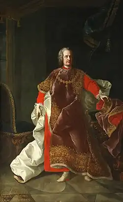 Initially known as a captain, Batthyány fought in 1716 at the Battle of Peterwardein and at the Siege of Temesvár under the command of Prince Eugene. He then switched to the civil service.[1] In 1737 he became the Hungarian Court Chancellor in Vienna. As such, he took part in the Diet in Pressburg in 1741 and supported Empress Maria Theresa in a memorable speech.[1] He was Chief Cupbearer (Obermundschenk), privy councilor and from 1744 a Knight of the Golden Fleece (No 712). In 1751 he became the last Palatine of Hungary until his death. In 1756 he raised a regiment of hussars that fought in the Seven Years' War.[1] He chose Bicske Castle as his administrative and head office and extensively remodeled it.[1]