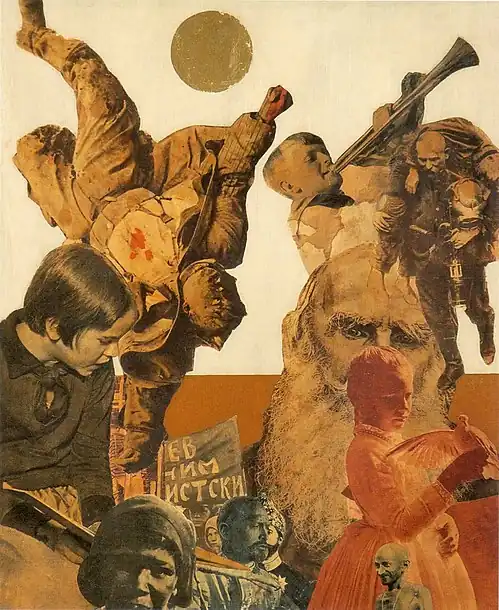 In Vajda’s photomontages “the extreme forces of the human world appear in a dramatic simultaneity: dead babies and decrepit old men, knife and bread, rifle and bird, tiger and lily: the jungle laws of the struggle for survival and pure flowers are composed into one picture in diagonals of tension.[21] These photomontages are completely different from the unreal Soviet propaganda montages of the age "with their monumental industrial machinery, dams and bridges".[22]