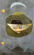 We see two faces in the picture: a face showing the artist’s personal features and a spherical head. From the interpenetration of the self-portrait and the spherical head, a “third” portrait may emerge that has a “new message”. “This third portrait shows a head looking to the left consisting of the aura-radiating spherical head's arc and the eyes and nose-line of the personal self-portrait. Thus arises the “genuine face”, “the face of Man” uniting individual and accidental features with the divine icon's spherical head."[29] Other interpretations are also possible.[30])