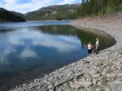 The nearest city is Cokeville, Wyoming about 34 miles (55 km) to the southwest. Access to the lake requires traversing a winding 28-mile (45 km) dirt mountain road, and fording a creek with water as deep as 18 inches (0.46 m) in the spring time. A high clearance vehicle is recommended. The road ends at Hobble Creek campground and from there a 1.5-mile (2.4 km) hike up a moderately steep mountain trail is required to reach Lake Alice. Nine primitive tent campsites are available though camping is not restricted to a campsite.