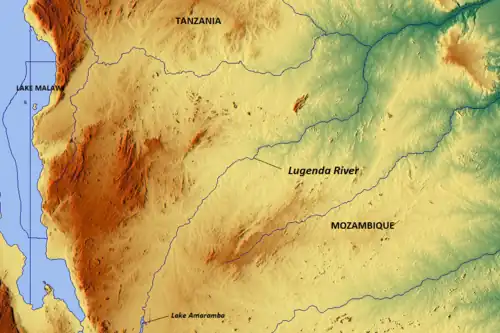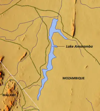 Lake Amaramba (Portuguese: Lago Amaramba) is a shallow lake in Mozambique, near the border with Malawi. Located in the Nyasa plateau, it is north of Lake Chiuta.[1] The lakes are separated by a sandy ridge and a channel links the two lakes. On the western side of the channel, the connecting waterway is known as the River Msambiti while on the eastern side, it is known as the Lugenda River.[2] Lake Amaramba is intermittently linked to the Lugenda River, a tributary of the Ruvuma River.[3]