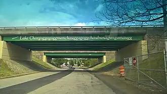 The lake's name comes from the Algonquian language of the Nipmuc and is often said to mean, "Fishing Place at the Boundaries—Neutral Meeting Grounds".[1] A more fitting translation is "lake divided by islands", according to anthropologist Ives Goddard.[2] The most memorable translation, however, is supposedly: "You fish on your side; we fish on our side; nobody fish in the middle."