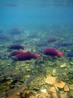 Salt marshes along the Cook Inlet represent one of the most productive ecosystems in the park. They account for under 1% of the park's area, but provide a source of food in early summer for both brown and black bears.[32] Lake Clark's coastal areas are rated as some of the top bear viewing destinations in the world, along with the coast of Katmai National Park. Most bears are concentrated at Chinitna Bay or Silver Salmon Creek when the fish are running. Chinitna Bay is considered by some to be one of the top bear viewing destinations in Alaska.[13][33] Tuxedni Bay, north of Chinitna Bay, also provides excellent bear viewing; up to 20 brown bears have been spotted feeding on clams and sedges at a time. Fewer people visit the bay and therefore it is easier to view bears in peace.[34] Inland areas of the park also provide bear viewing. Crescent Lake provides excellent bear viewing in June, July and August. Both grizzly and black bears are present, but grizzly bears are more common and seen more often, since black bears are shier and are easily displaced by their larger cousins.[35] On the other side of the park, the Kvichak River is the world's most productive watershed for sockeye salmon, whose offspring account for 33% of the species' catch in the United States and 16% of world production. Salmon are so plentiful that a wolf pack at Lake Clark has been documented as the only salmon-dependent pack in the world.[13]