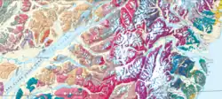 Lake Clark preserves a wide variety of Alaskan landscapes and ecosystems, corresponding to its four main physiographic areas. The coastal sections running along the Cook Inlet from Tuxedni Bay to Chinitna Bay include coastline and marine ecosystems. The mountains of the Alaska, Aleutian and Chigmit Ranges with their glaciers form a second region. On either side of the mountains the valley, lake and foothill areas present a glacially altered landscape.[29] Boreal forest dominates the lower sections of the southwest part of the park, with white and black spruce making up most of the coniferous trees. White spruce have been affected by spruce bark beetle infestation, and spruce needle rust outbreaks have been so heavy that the surface of Lake Clark has been colored orange by spores.[30] Farther north and west lie the tundra regions,[7] primarily the result of elevation. The tundra supports caribou and ptarmigans.[31]