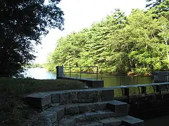 The Lake Cochituate Dam is a historic dam on the southwestern side of Lake Cochituate in Framingham, Massachusetts. The 62-foot (19 m) dam was built in 1890, replacing two earlier wooden dams, dating back to the 1846 construction of the Cochituate Aqueduct. The core of the dam is granite rubble laid in concrete. Lake Cochituate was taken out of service as part of Boston's public water supply in the 1930s, and the lake and dam were eventually turned over to the state, which established Cochituate State Park.[2]