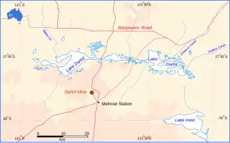 Lake Darlot is an ephemeral lake in the centre of Western Australia, lying approximately 50 km (31 mi) east-north-east of Leinster, and 125 km (78 mi) north of Leonora in the Goldfields-Esperance region.[1] Its surface elevation is 434 metres above mean sea-level.[2]