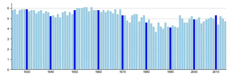 Annual maximum height (in meters) of the Niger River at the Diré hydrological station[21]