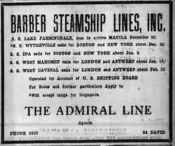 She was consigned to the Barber Lines by the Shipping Board. She sailed for her new company from New York bound for Yokohama, Japan on 5 October 1919.[10] She reached Japan via the Panama Canal, San Francisco, and Honolulu. She had a full cargo of general merchandise,[11] but lost a portion of her deck cargo, carboys of acid, in heavy seas off San Francisco.[12] After stopping in Japan, she reached Manila, Philippines on 21 December 1919. Once her cargo was unloaded, the ship was turned over to the Pacific Mail Steamship Company.[13]