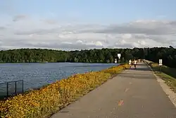 The lake has long had a nature trail around the lake, including passing through the Botanical Garden of the Ozarks. The Lake Fayetteville Nature Trail is a dirt path with tree markers passing through the oak-hickory forest typical of the Ozark Mountains. The first segment of paved trail connecting to the Razorback Regional Greenway was completed in 2007,[5] with a full 4.5 miles (7.2 km) paved trail around the lake completed in 2013.[6] The nature trail was rehabilitated and expanded into a mountain biking trail beginning in 2010.