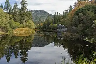 The lake is surrounded by an incense cedar-Douglas fir forest and hosts an artificial grove of seven giant sequoias along its northern shores, the largest of which stands 67 ft (20 m) tall.[1] The environmental conditions of the San Jacinto Mountains mimic those of the Sierra Nevada, allowing the giant sequoia trees of Lake Fulmor Grove to naturally propagate.[2]